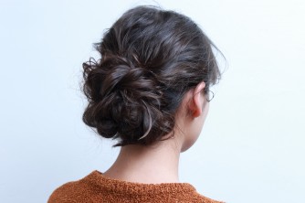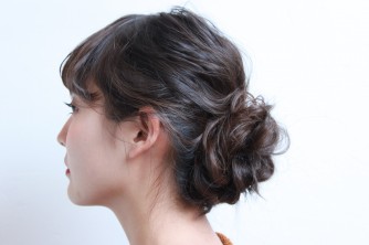 なみなみに巻いた毛をゆるくポニーテールにし,根元に巻き付けただけの簡単アレンジ
