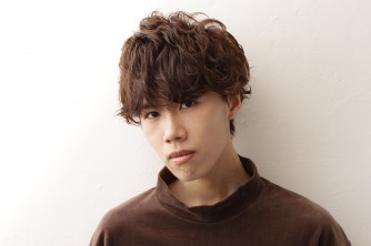 ソフトに2ブロックにし、重めに前髪をつくり強めにパーマをかけたスタイル